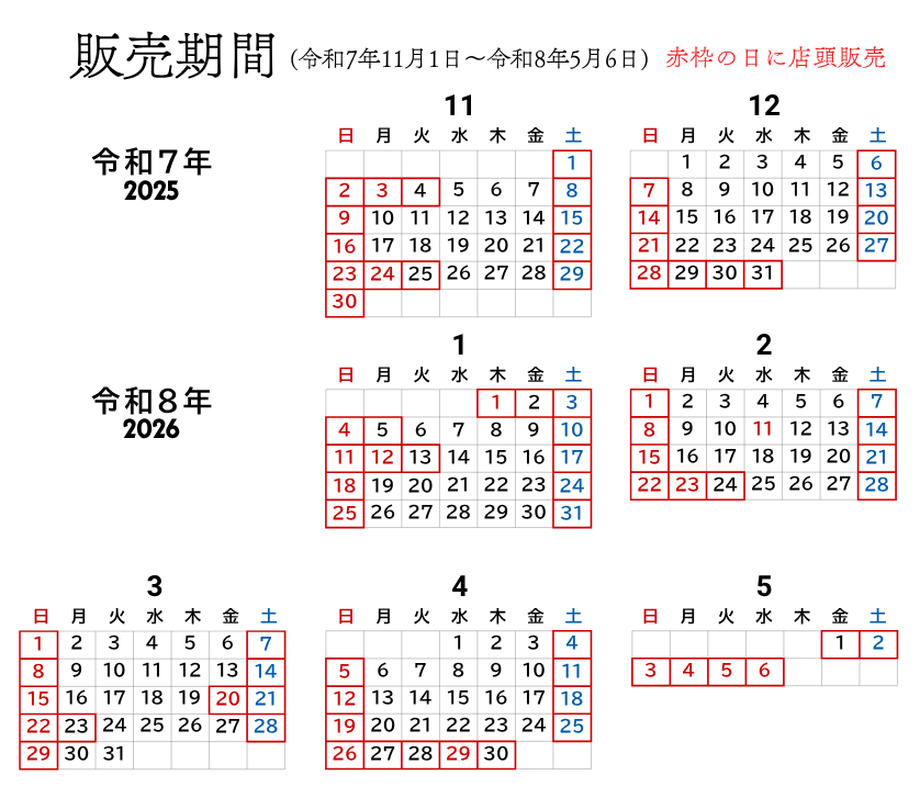 詳しい日程は、カレンダー、赤枠が販売日です。