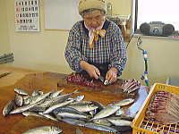 | あ〜あ、アジの頭が切れちゃった。 | 民宿の女将さんたちもお手伝いをしてくれました。 | |